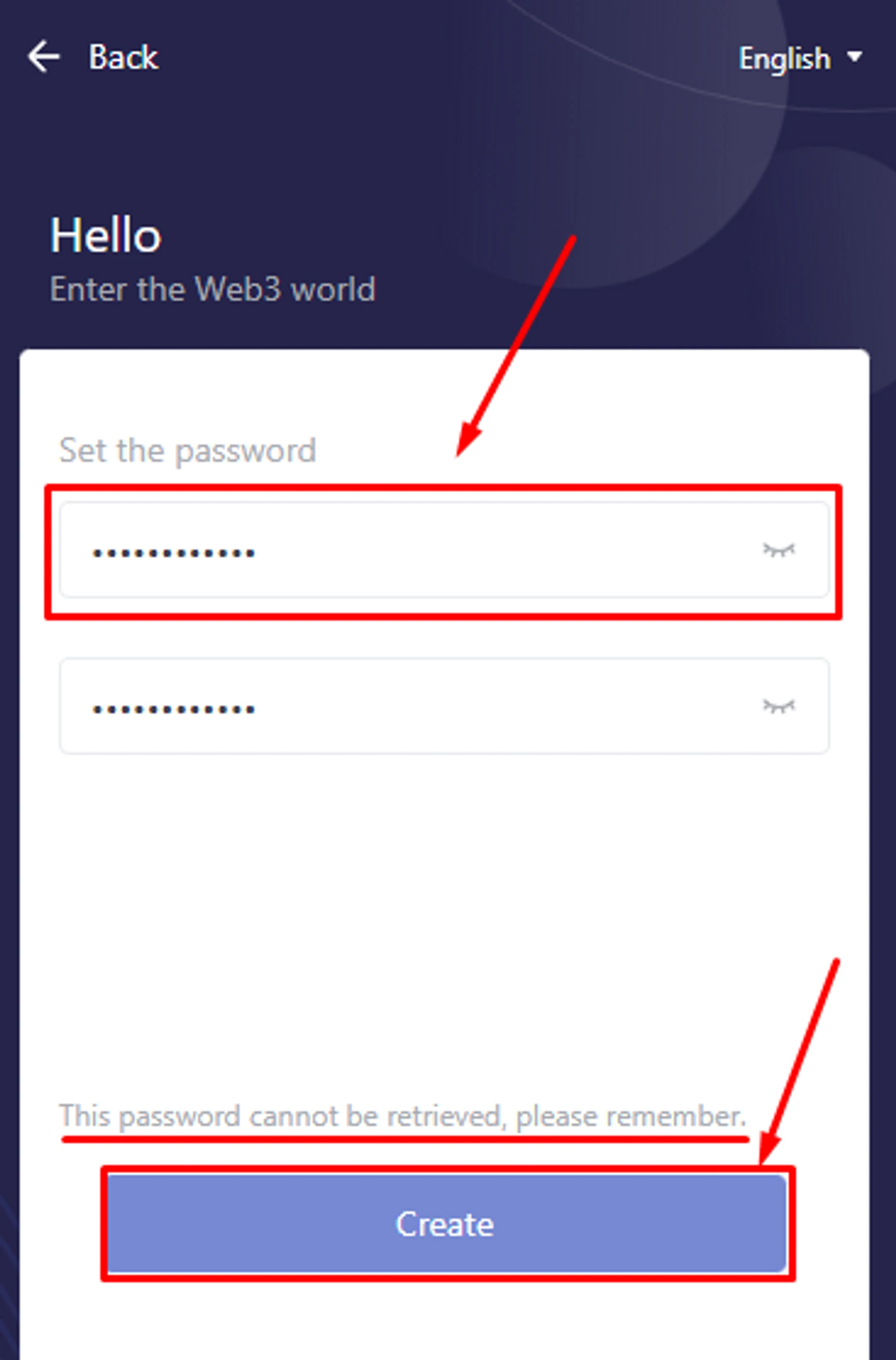 Встановіть пароль для доступу до гаманця, підтвердьте його, натиснувши “Create”;