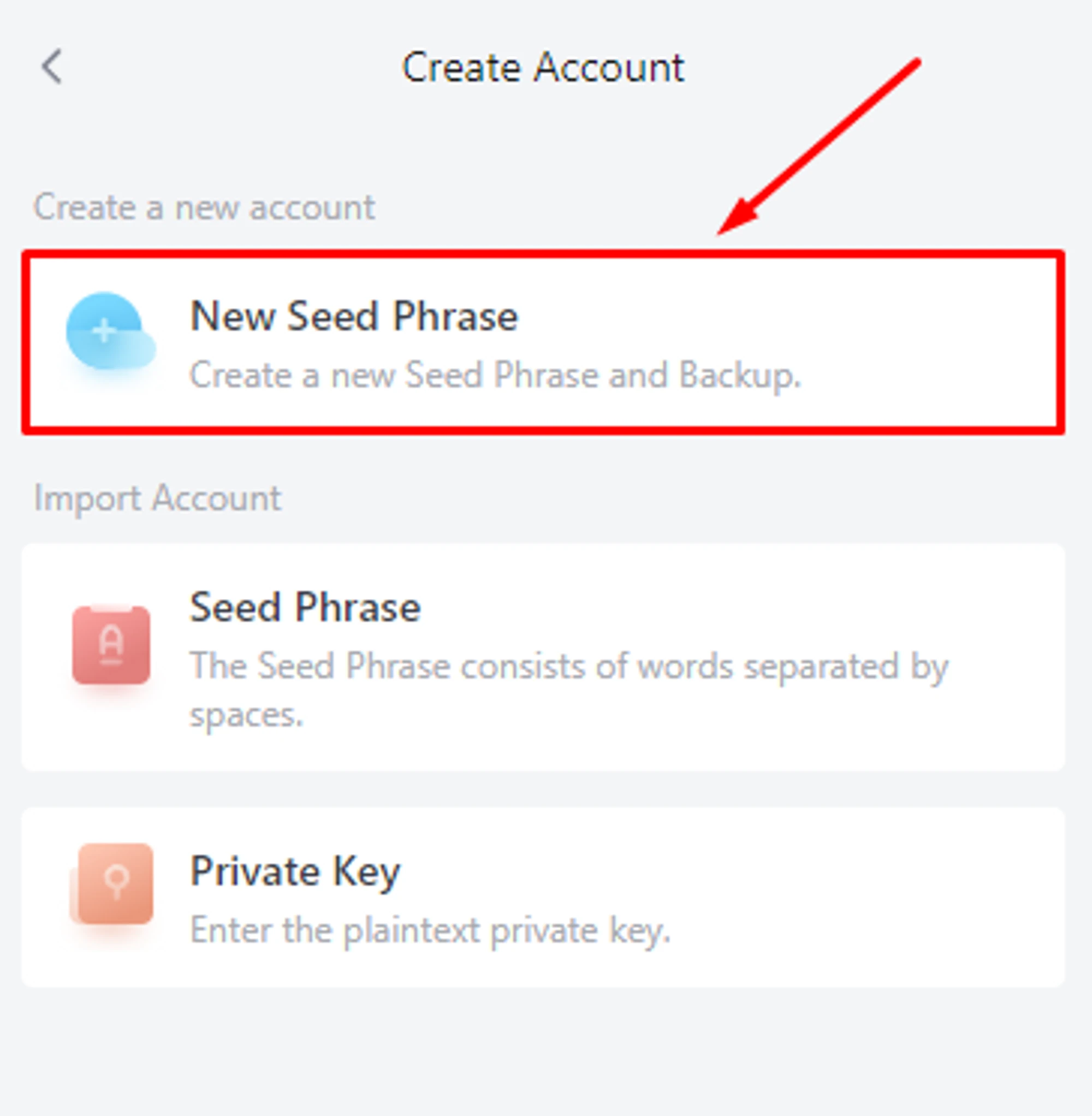 Відкриється меню створення облікового запису. Виберіть “New Seed Phrase (Нова секретна фраза)” → Вкажіть “Group name (ім'я для гаманця)” → Натисніть “Create (Створити)”;