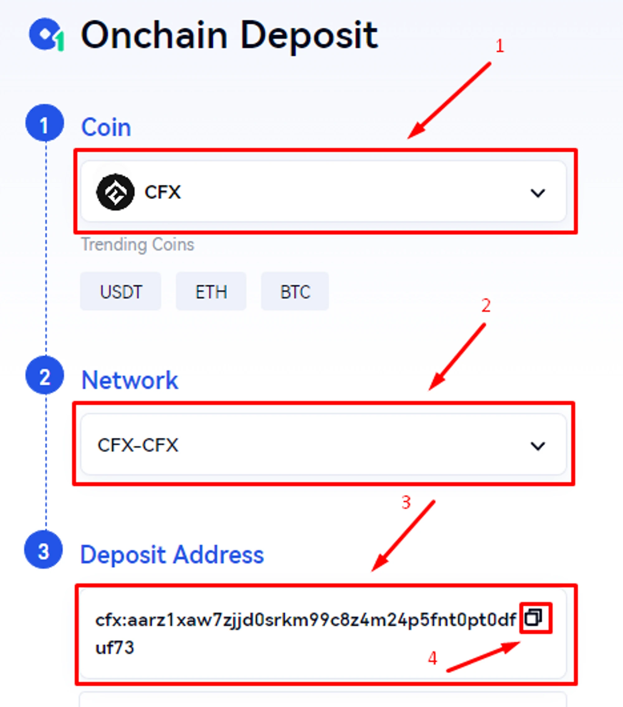 Відкриється сторінка депозитів. Оберіть “Монета → CFX”, “Мережа → CFX-CFX”, отримайте “Адресу депозиту”;