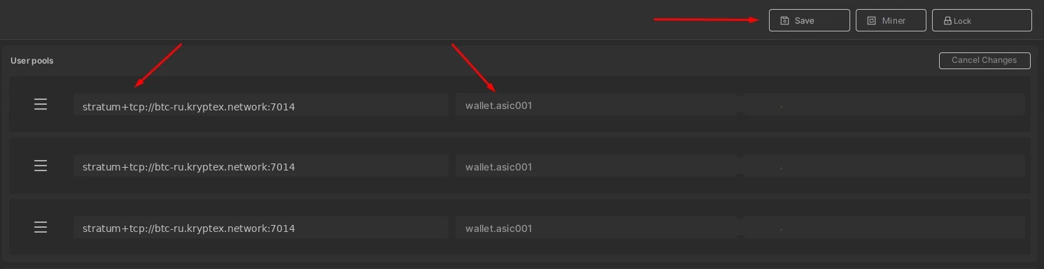 - После перезагрузки АСИКа, настройте майнинг на пул криптекса — https://pool.kryptex.com