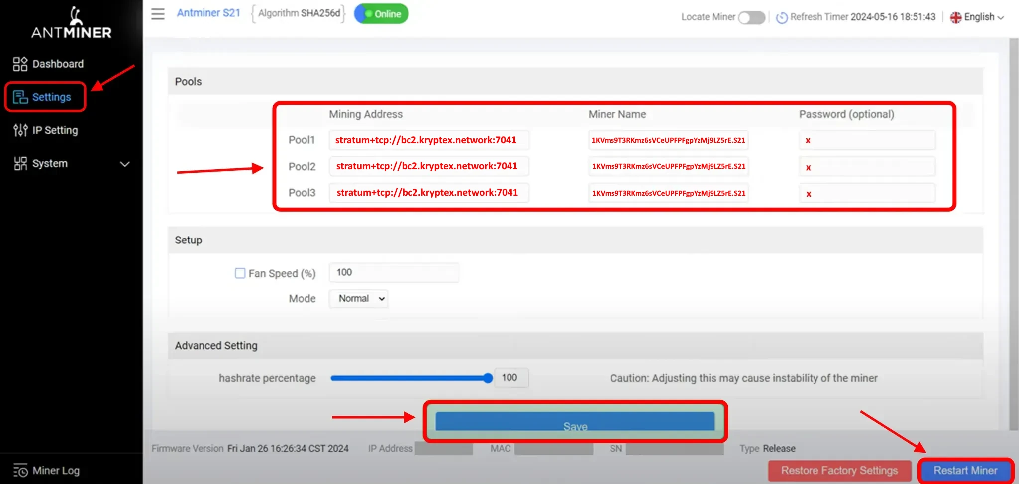 solo:antes de tu dirección de cartera en la configuración del ASIC. Ejemplo:solo:1KVms9T3RKmz6sVCeUPFPFgpYzMj9LZ5rE.S21 - Asegúrate de usar una dirección de cartera de Bitcoin II BC2.