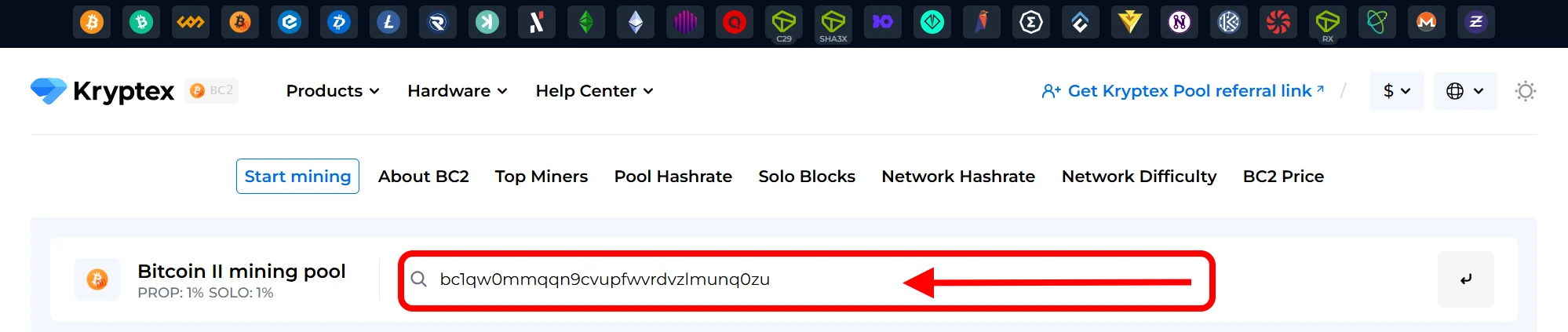 Abre la página del pool de Bitcoin II BC2 e ingresa tu dirección de minería;