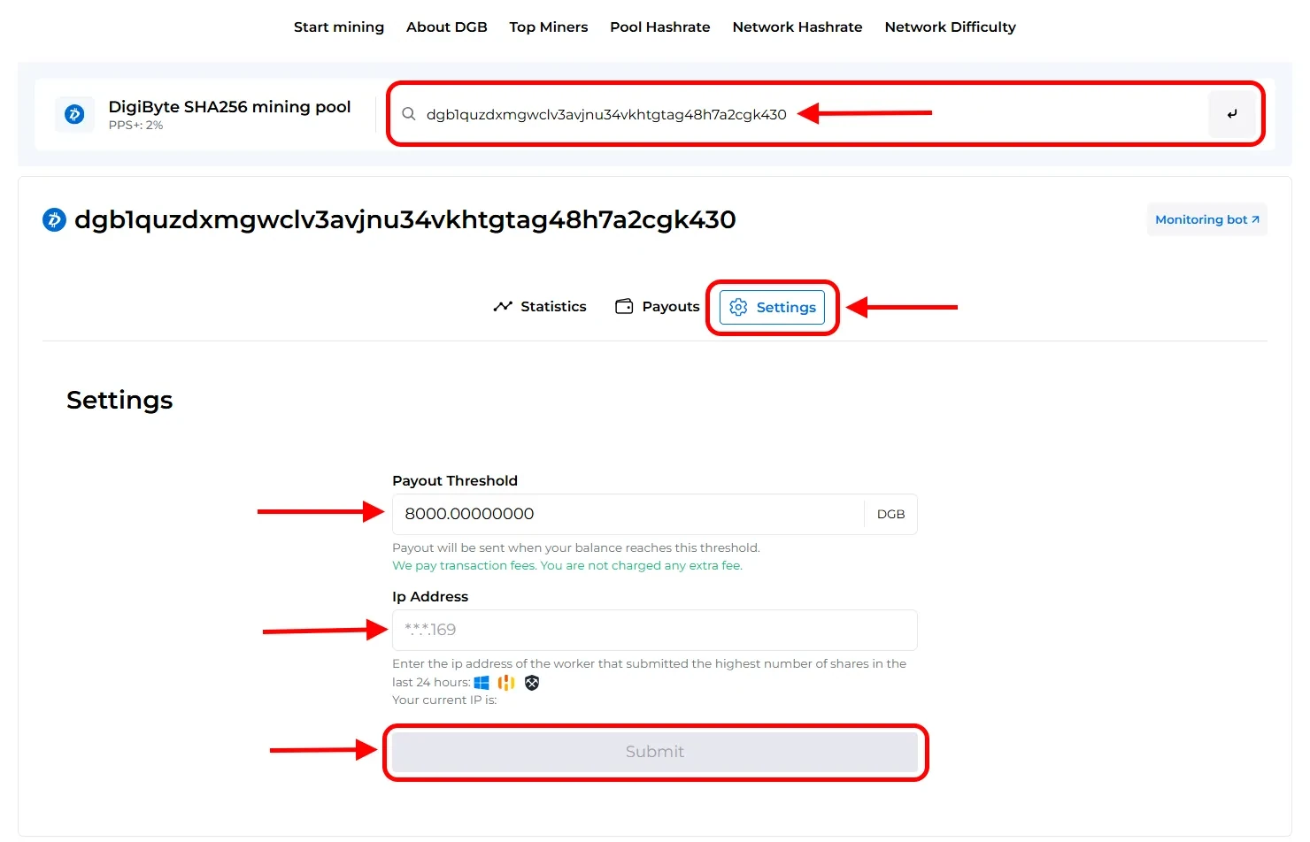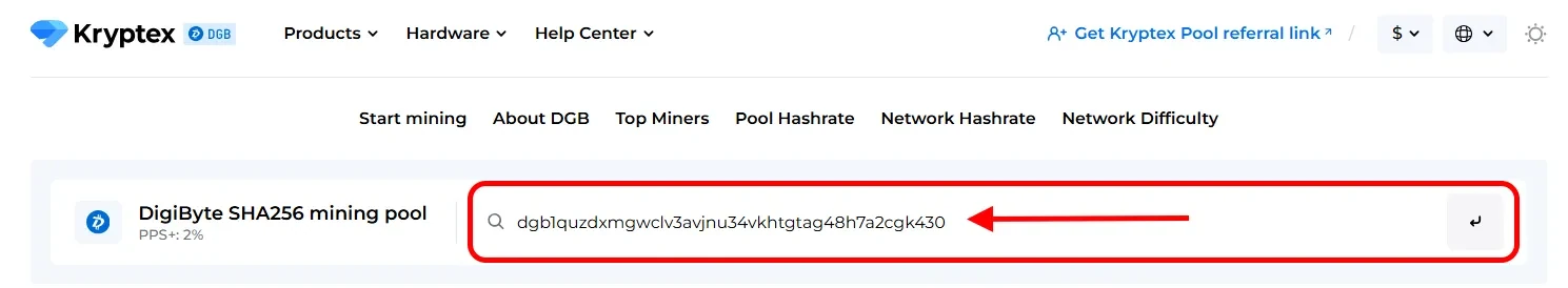 Open the DigiByte DGB pool page and enter your mining address;