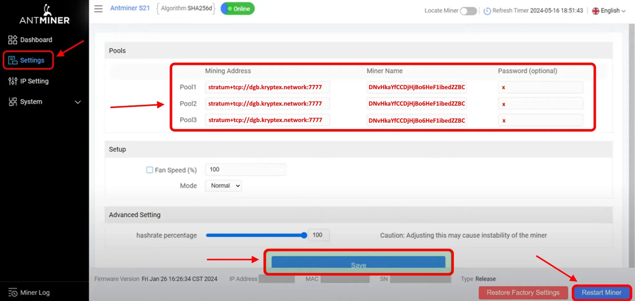 Navigate to the settings section, typically labeled "Miner Configuration" or "Settings".
