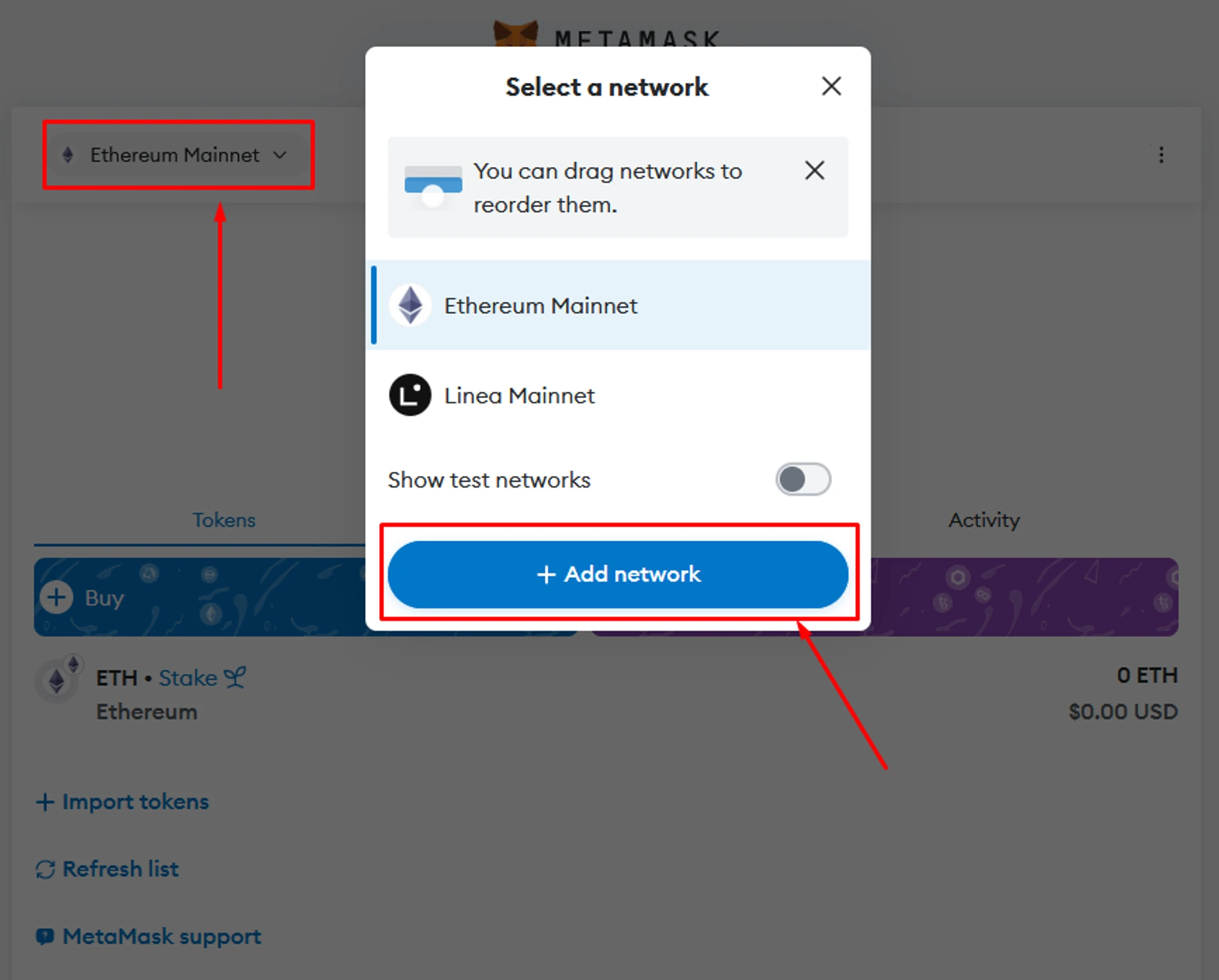 Open your Metamask wallet → click on the name of current network;