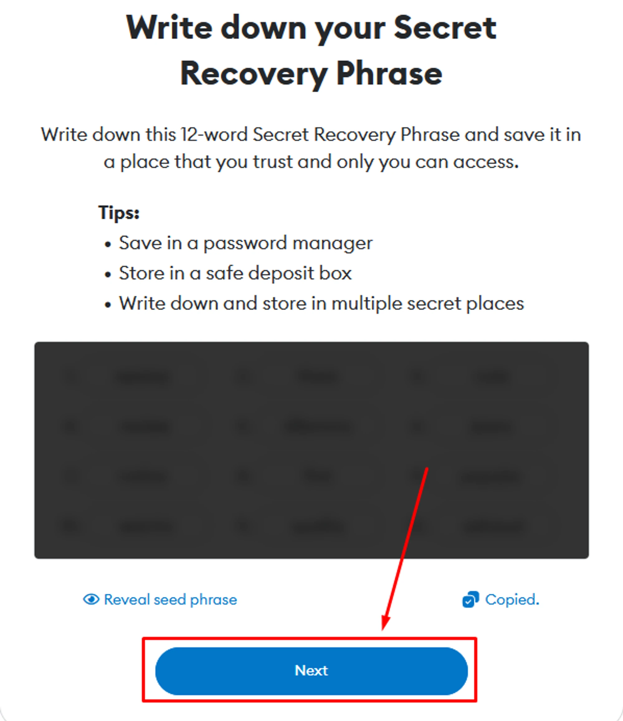 You will receive a secret phrase — a combination of 12 words. Safely keep them in the same order as they appear on your screen. Losing them means losing access to your wallet! Then click “Next”.