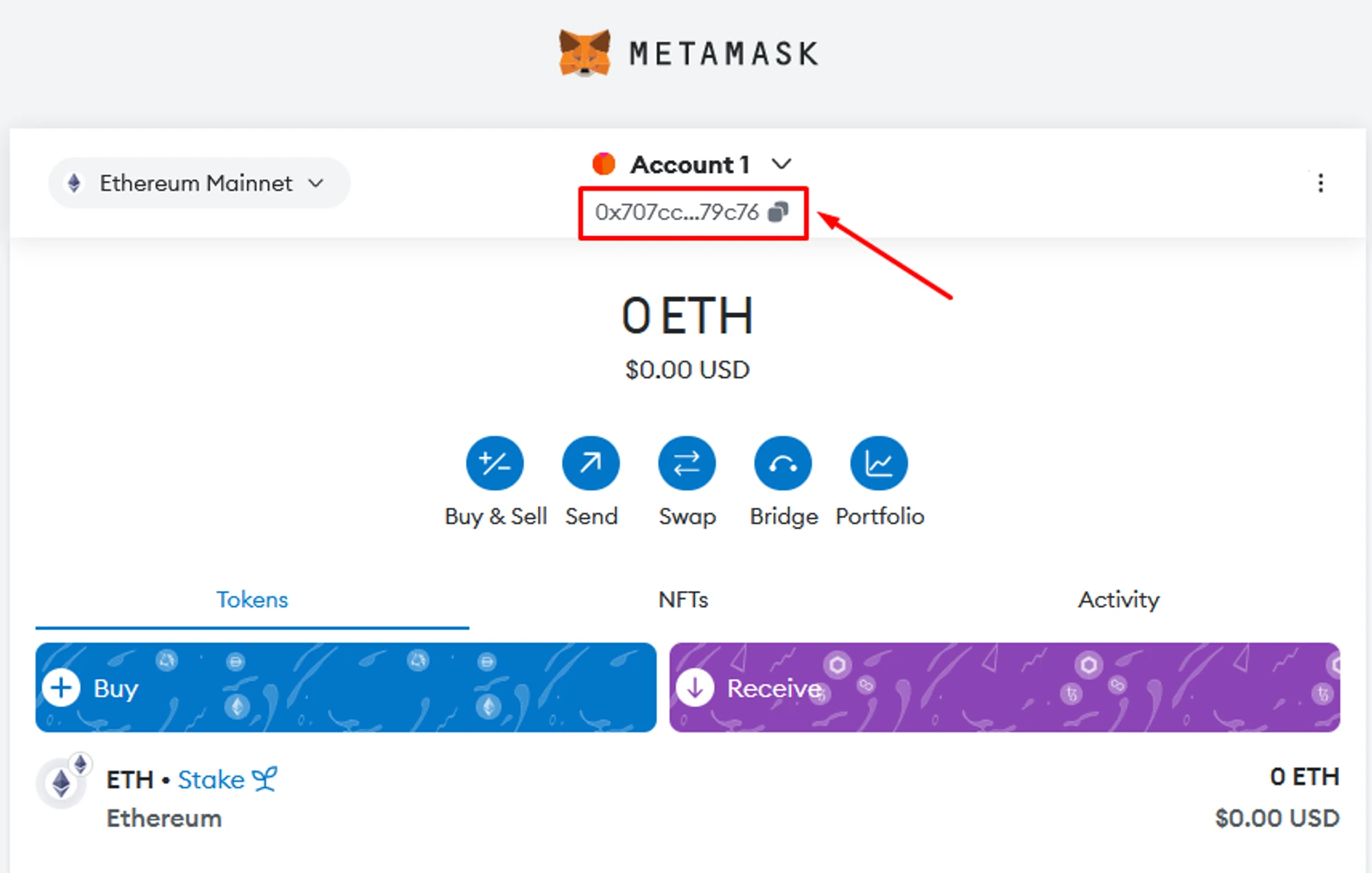 Your wallet is ready to go! First, click on the icon next to the wallet address to copy it. Then, use it for mining or receiving coins.