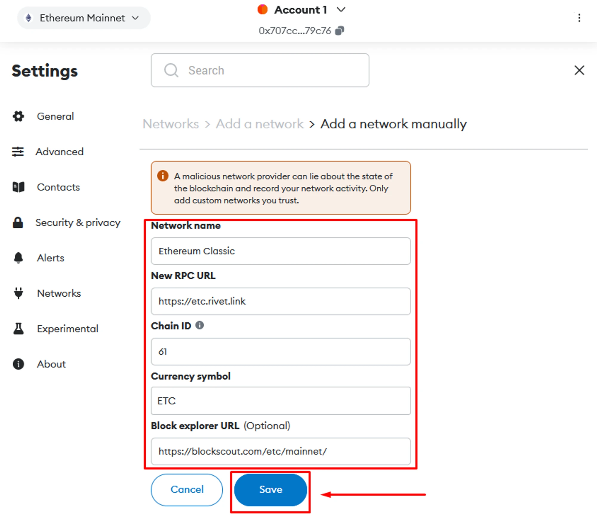 Enter the data for the new network (Ethereum Classic network is used as an example) → Click ”Save”;