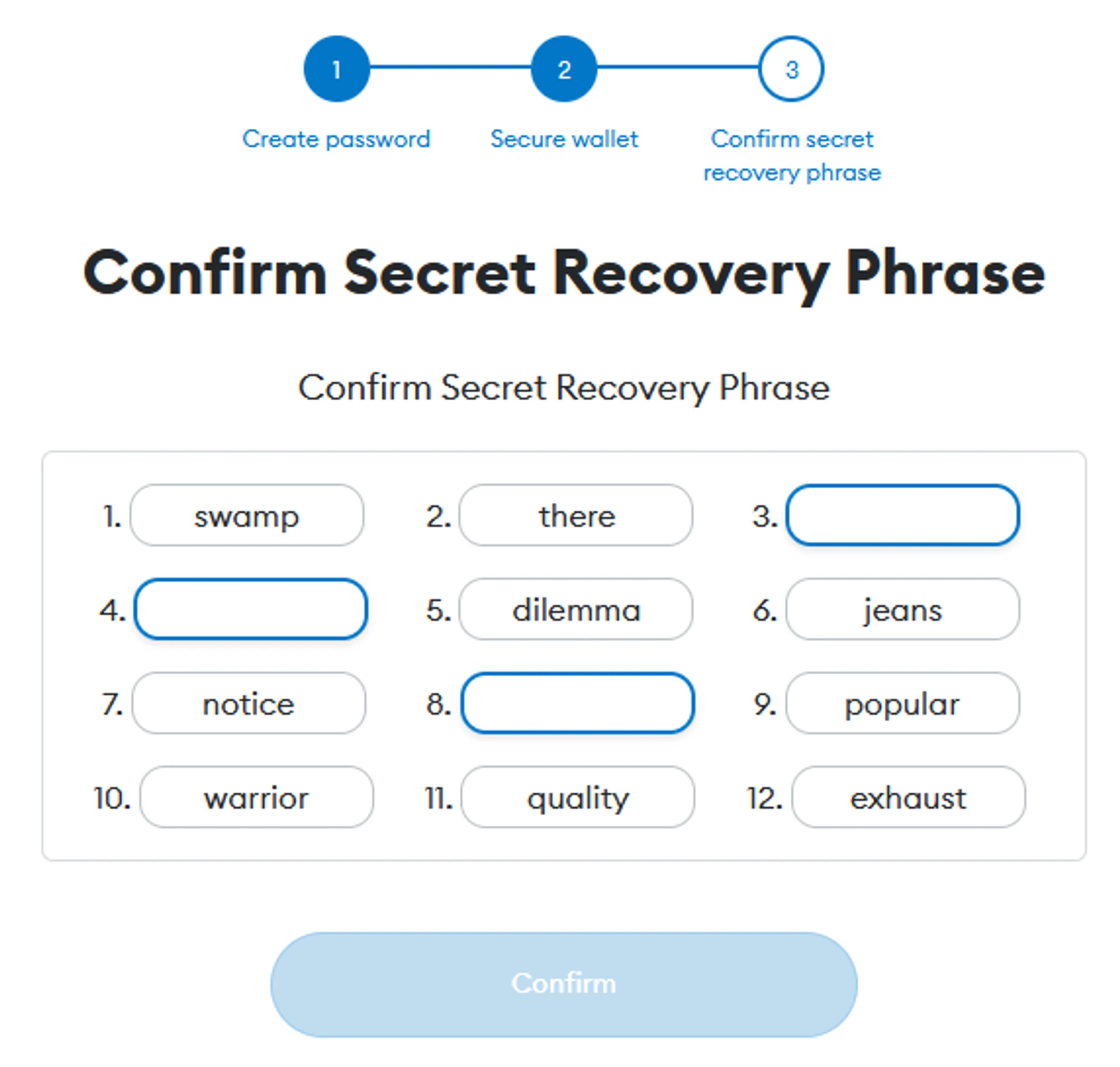 The wallet will check how well you remember your seed phrase and word order. The dialog window will ask you to choose the correct word in the given order three times → specify the words and click “Confirm”.