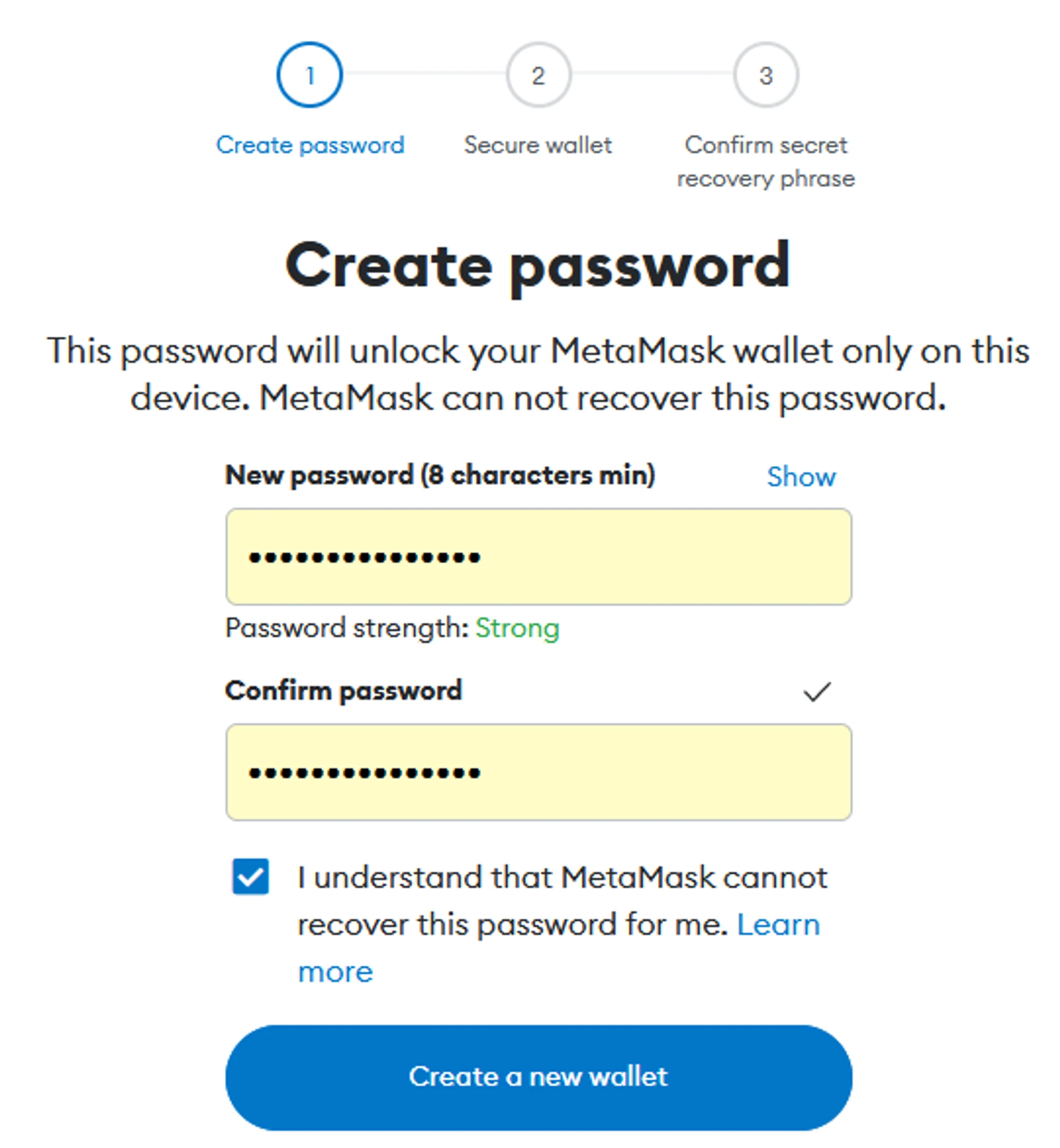 The wallet asks you to enter a password for your wallet and confirm it. Generate reliable password with your browser or use the password generator. Enter the password, confirm it, and click “Create a new wallet”.
