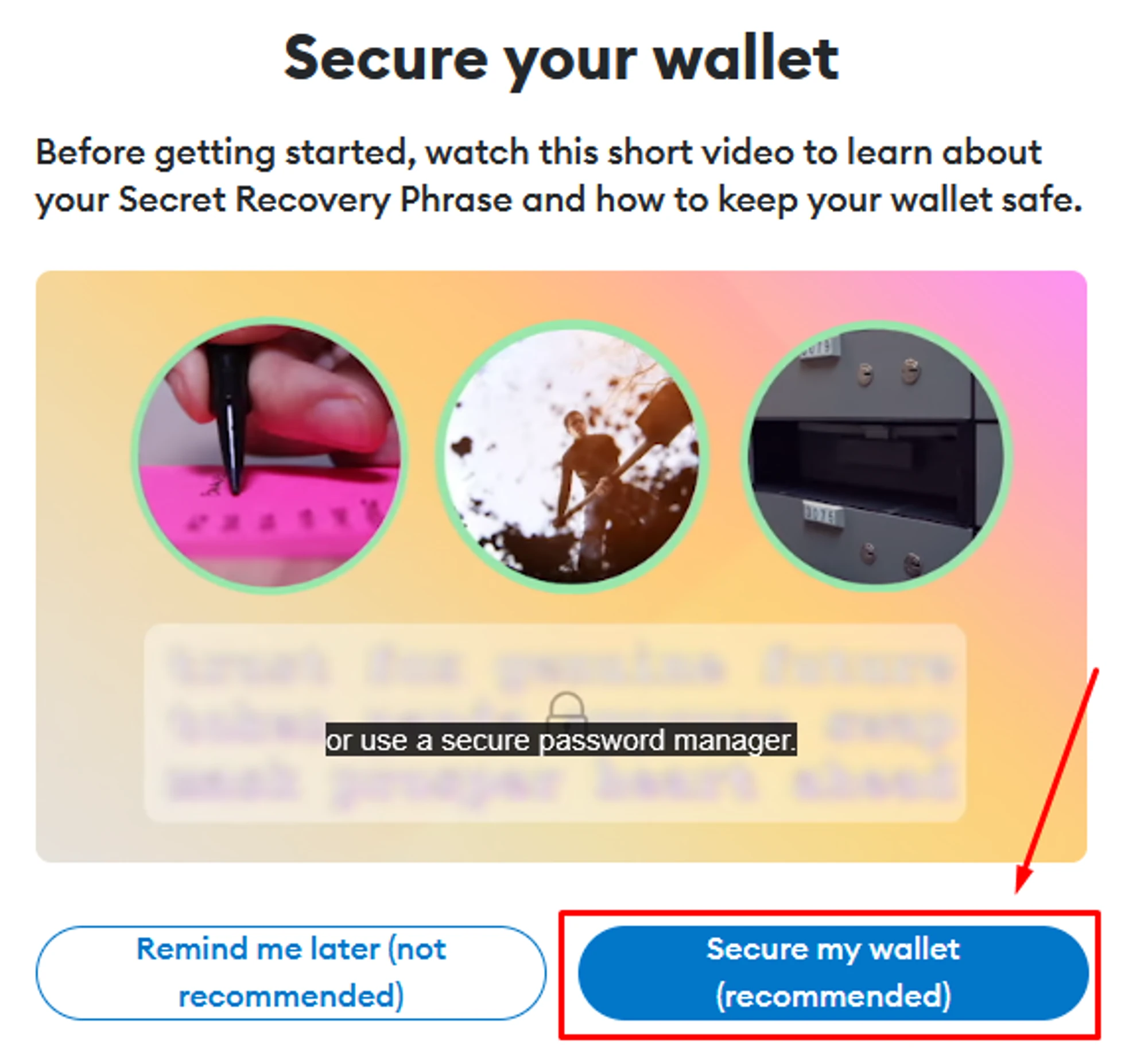 Watch the tutorial video and click ”Secure my wallet”;