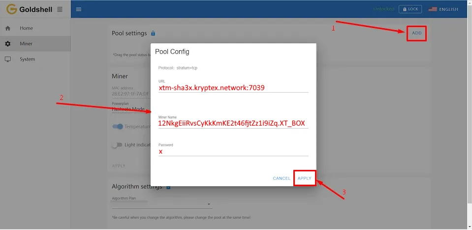 Allez dans l'onglet “Miner → Pool Setting → Add” pour configurer votre ASIC.
