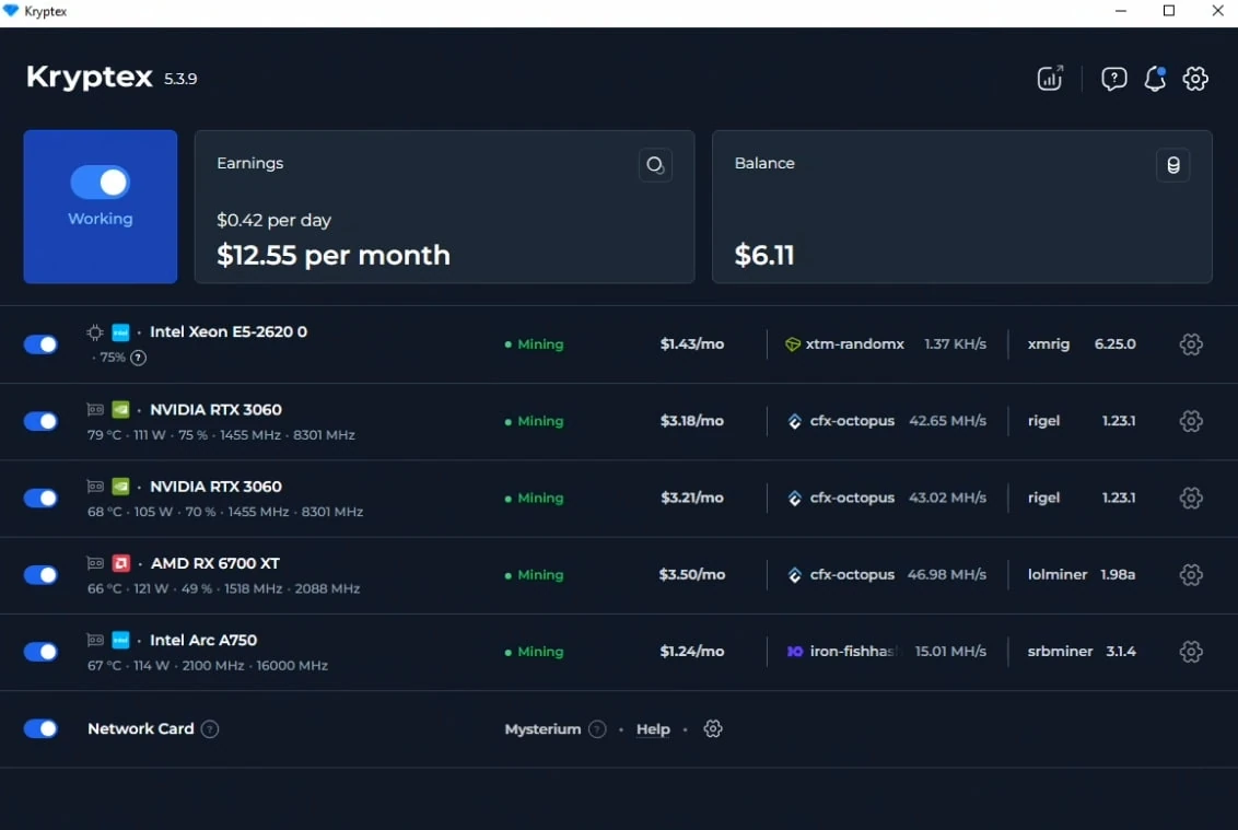 Dans la capture d'écran, vous pouvez voir l'application de minage Kryptex pour PC. Elle fonctionne avec quatre GPU différents de Nvidia, AMD et Intel. La performance maximale est atteinte grâce à Resizable BAR (ReBAR), même sur une ancienne plateforme Intel XEON E5. L'application détecte automatiquement si ReBAR, le décodage au-dessus de 4G et le CSM sont activés, sélectionne la pièce la plus rentable à miner et change d'algorithme en fonction de la rentabilité.