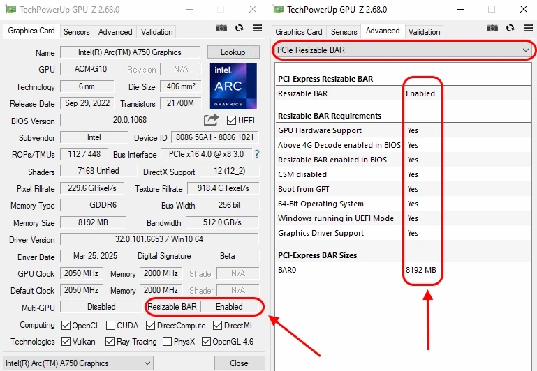 GPU-Z est le moyen le plus simple. Téléchargez l'utilitaire, lancez-le et trouvez la ligne "Resizable BAR". Si elle indique "Activé", tout fonctionne. La valeur BAR doit correspondre à la taille de la mémoire vidéo de la carte. Si la carte a 12 Go mais que BAR affiche 8 Go, la configuration est incorrecte.