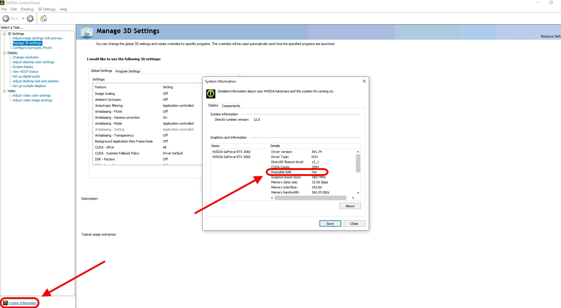NVIDIA : ouvrez le Panneau de configuration NVIDIA → Informations système (en bas à gauche) → trouvez la ligne "Resizable BAR" — elle doit indiquer "Oui".