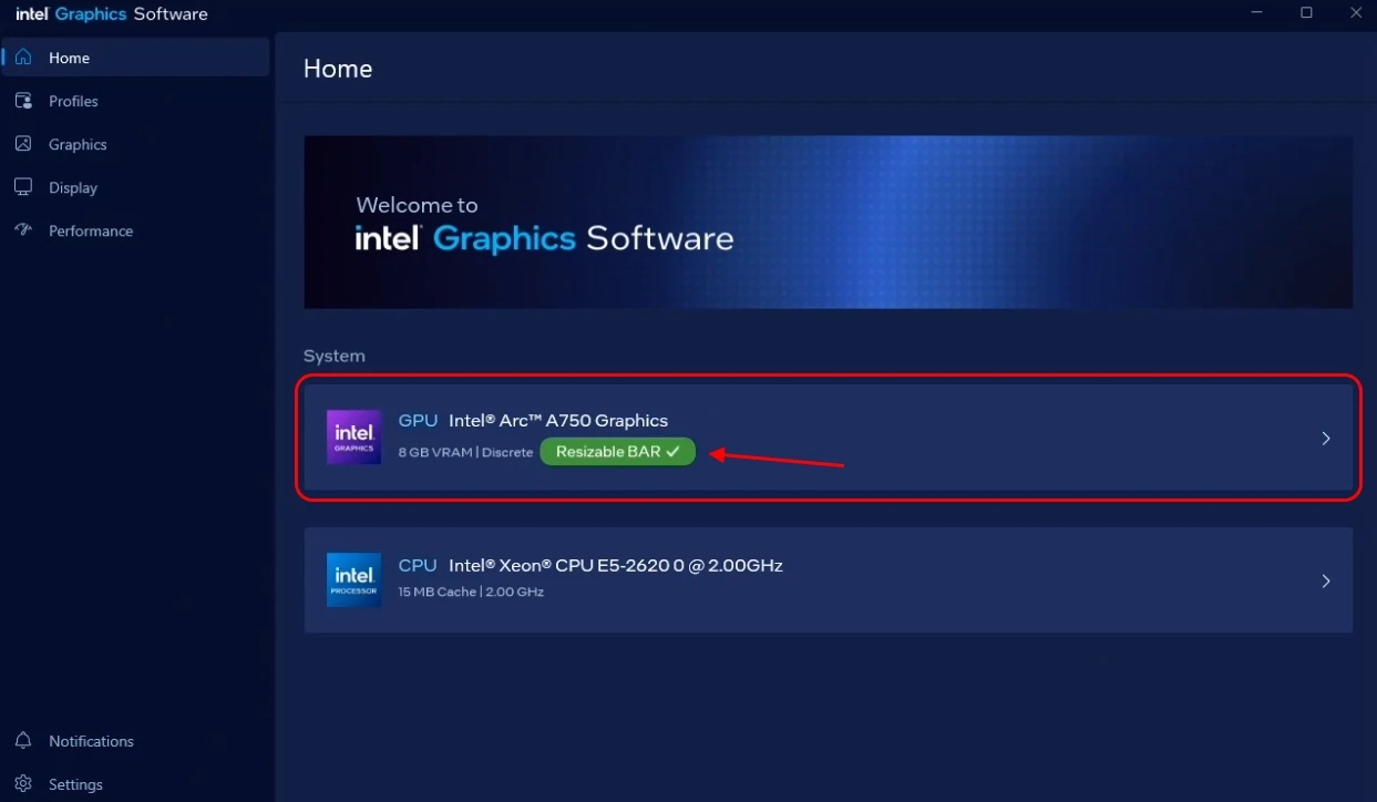 Intel : vérifiez le statut de Resizable BAR dans le logiciel Intel Graphics. Il est affiché directement sur la page principale de l'application dans le bloc de statut du GPU.