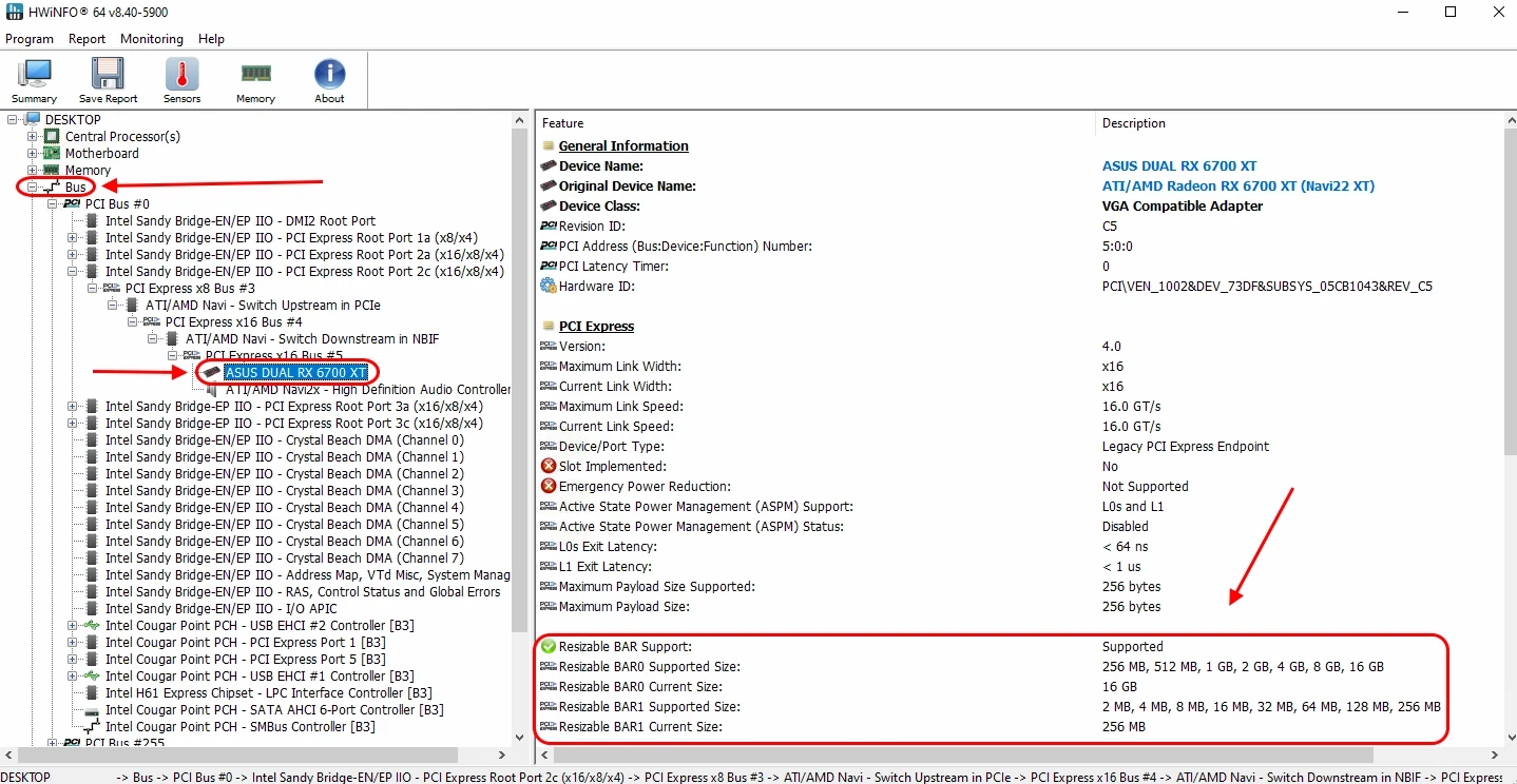 HWiNFO — montre ReBAR pour tous les appareils PCI Express. Ouvrez le programme, trouvez le GPU dans la section Bus. Regardez deux champs : Taille prise en charge (le maximum que la carte supporte) et Taille actuelle (la taille actuelle de BAR). Si la Taille actuelle est égale à la capacité totale de VRAM, ReBAR fonctionne. Si elle affiche 256 Mo, ce n'est pas le cas.