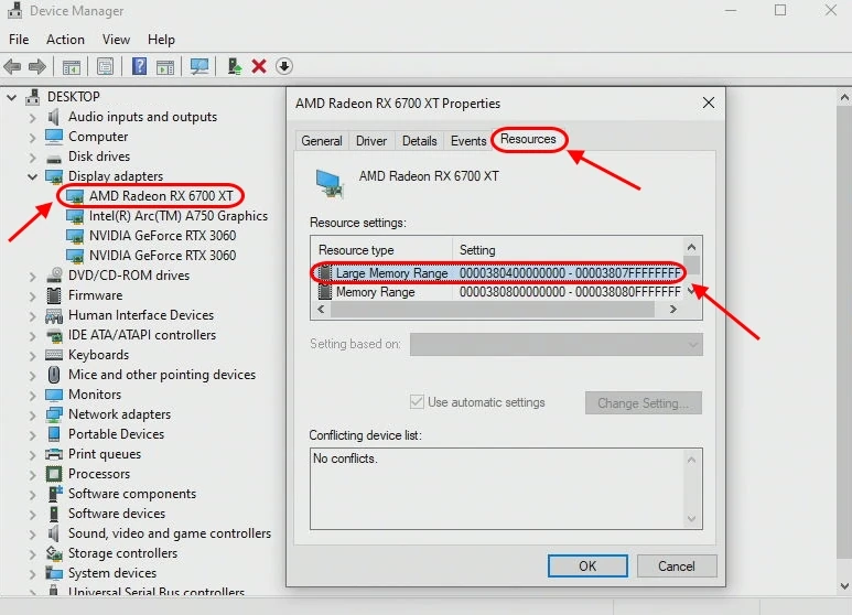 Gestionnaire de périphériques Windows : Adaptateurs d'affichage → clic droit sur le GPU → Propriétés → Ressources. Si la liste contient "Large Memory Range" avec une taille correspondant à la VRAM de la carte, ReBAR est actif.