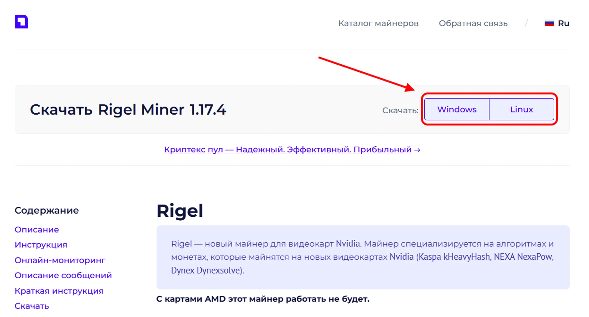Переходим на сайт miner.download и скачиваем нужный майнер для вашей операционной системы (Windows или Linux).