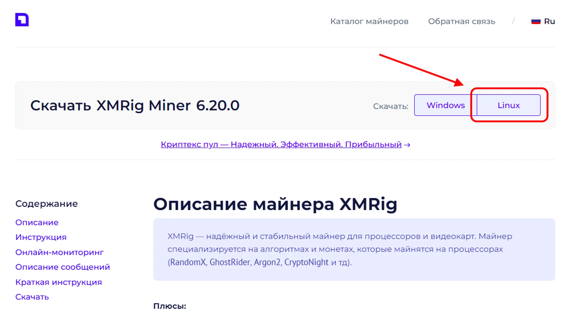 Откройте сайт miner.download и скачайте майнер XMRig для Linux.