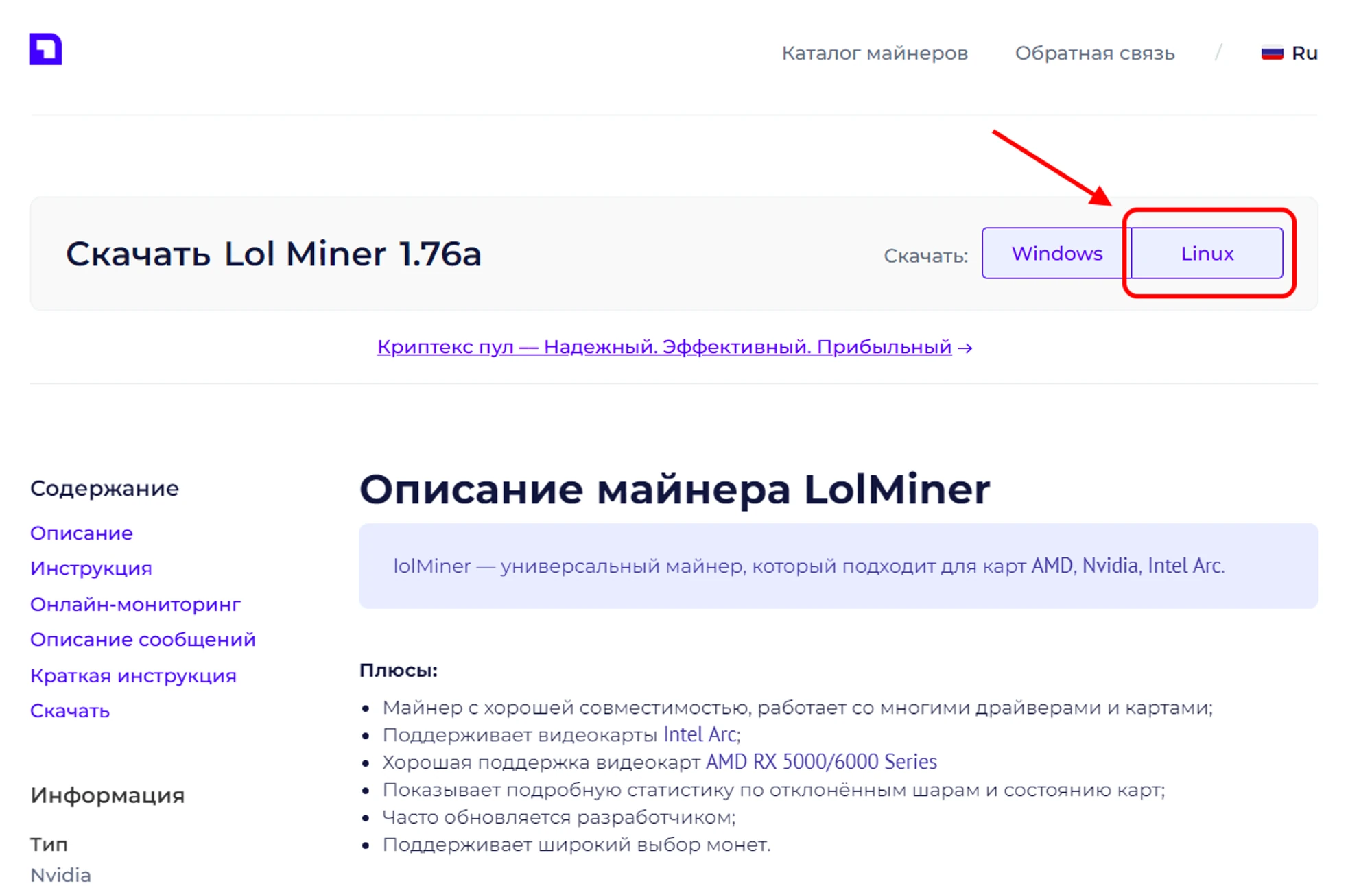 Открываем сайт miner.download и выбираем майнер. В нашем случае lolminer. Скачиваем версию для Linux.