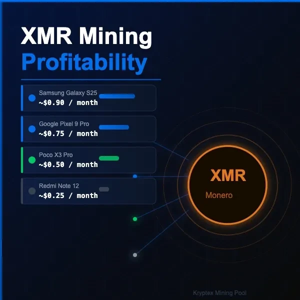 При ~$339/XMR і хешрейті мережі ~5.8 GH/s, телефон, що майнить на 500 H/s, заробляє приблизно $0.5–$1 на місяць.